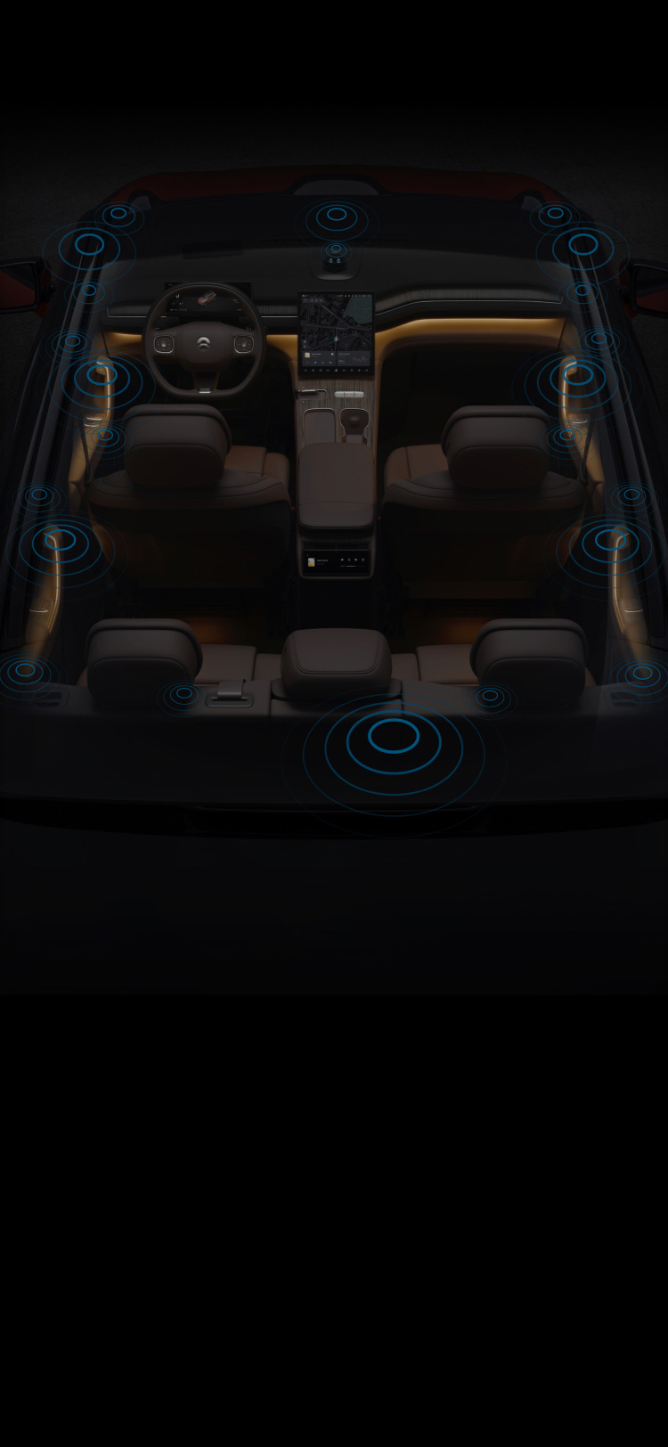 AmbientbeleuchtungDie weiche Beleuchtung mit diffuser Reflexion betont das schwebende obere Instrumentenbrett, vergrößert den Raum optisch und verleiht dem Innenraumambiente eine besondere Note.
