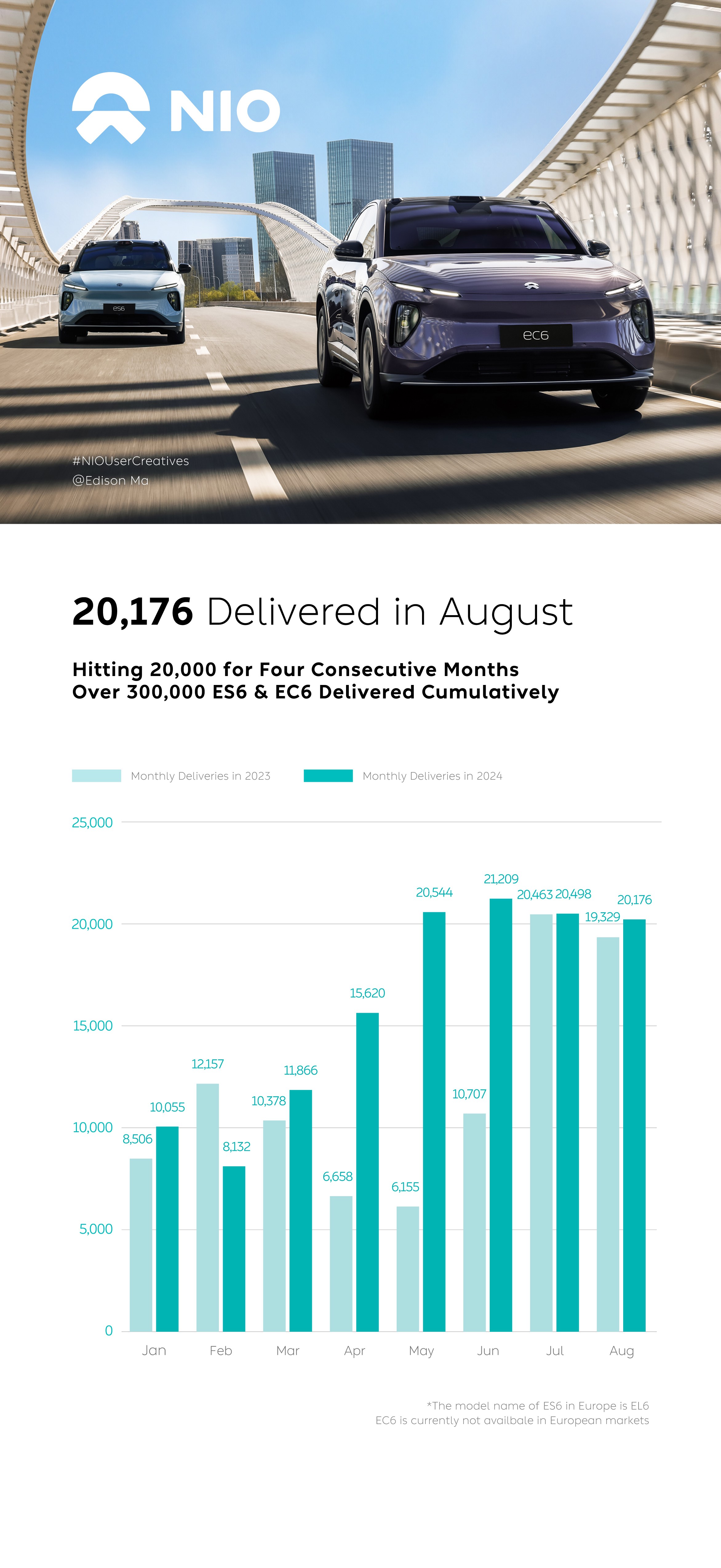 NIO Delivered 20,176 Vehicles in August, Hitting 20,000 for Four Consecutive Months
