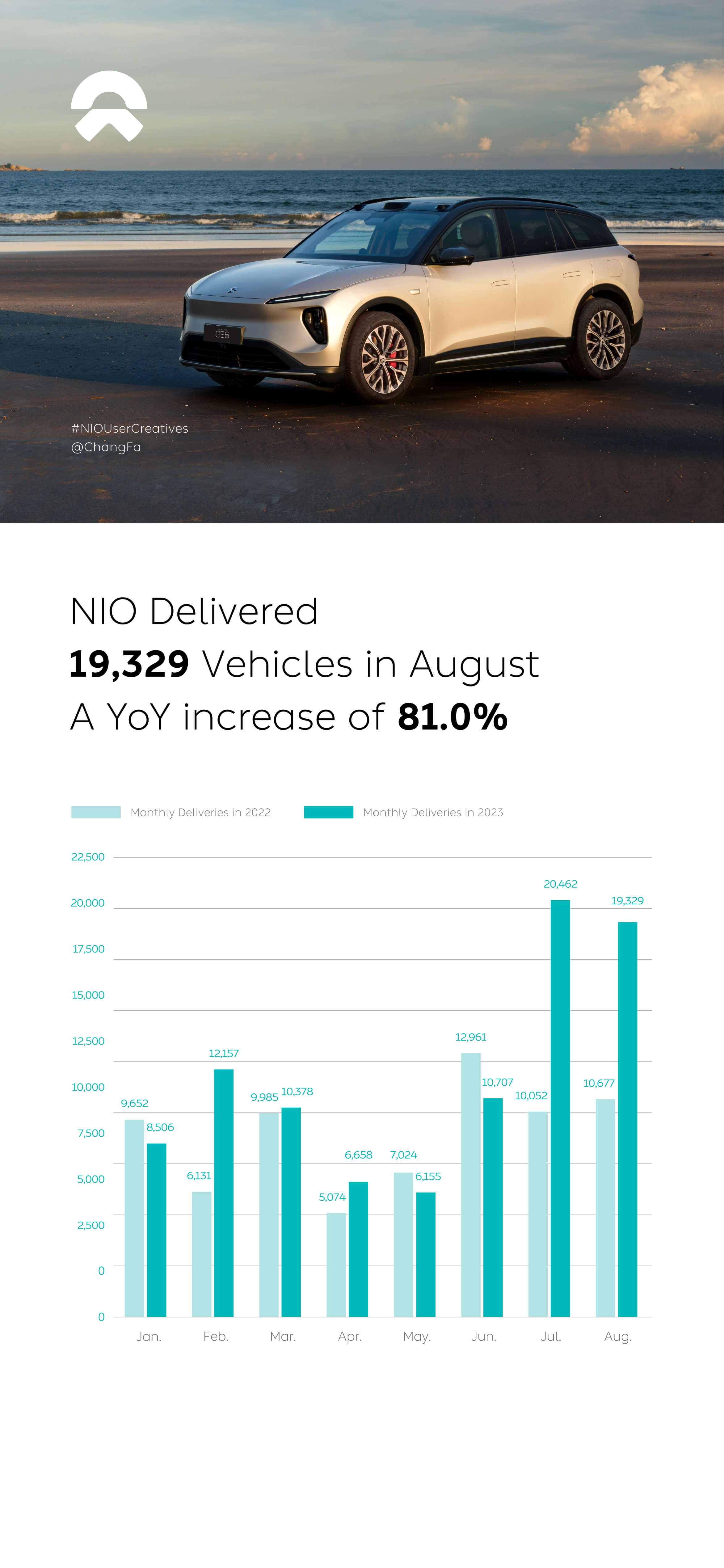 NIO Delivered 19,329 Vehicles in August, a YoY Increase of 81.0%