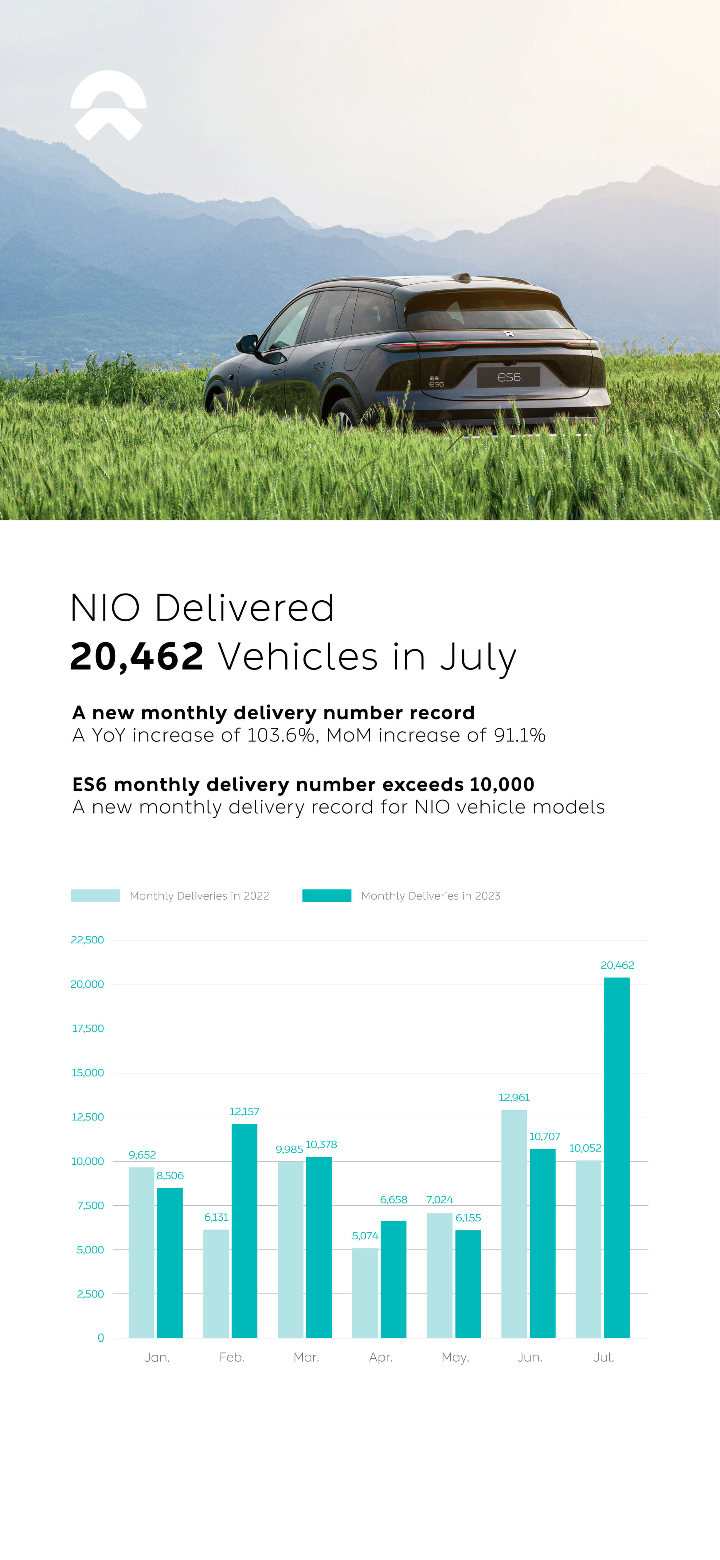 NIO Achieves Record Deliveries of 20,462 in July, With More Than 10,000 ES6 Delivered