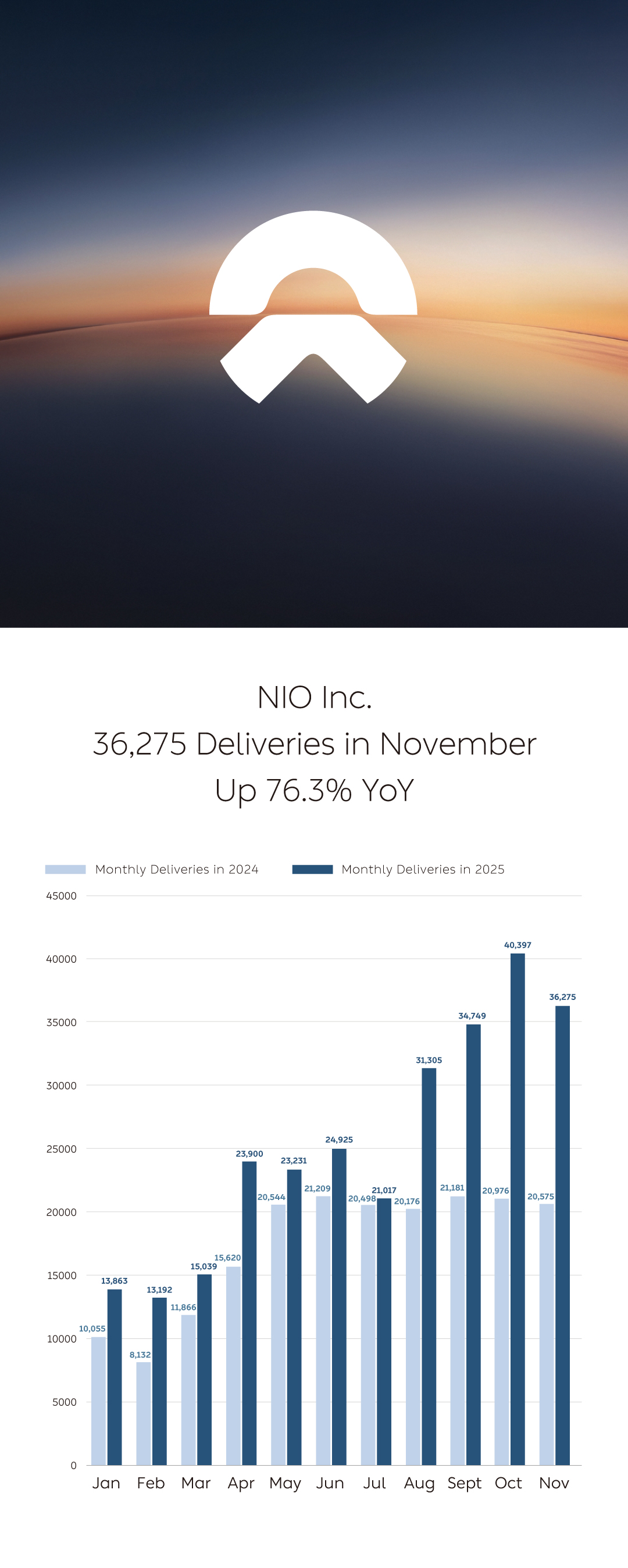 NIO Inc. Delivered 36,275 Vehicles in November, Up 76.3% YoY